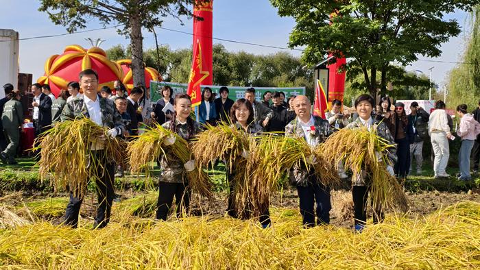 随着“下田割稻”的哨声响起,农户们带领“割稻体验队”来到稻田地里。“左手把着水稻根部,用镰刀从外向里一提一拉,用一个巧劲儿,水稻就割下来了。”这边农户手把手教学,那边新老选手齐上阵,开始体验割稻子。“这活动非常有意义,我带着孩子一起来体验割稻子,我回忆起小时候在田里就是这样‘面朝黑土背朝天’,一干就是一天,已经30多年没有割稻子了,那时的记忆一下都回来了。”一位体验者说。