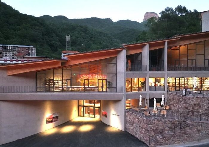 位于嶂石岩核心区的岩美术馆,这座由中央美院设计师打造的建筑,以太行山石为基底,43米单跨木梁创下国内纪录,曲直折的混凝土立墙与层叠木构屋檐相融,仿佛从山体中自然生长。馆内不仅举办高端艺术展览,还引入咖啡厅、文创空间,成为集艺术、阅读、休闲于一体的文化驿站。