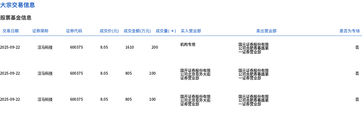 9月22日,汉马科技大宗交易成交400万股,成交额3220万元,占当日总成交额的2.46%,成交价8.05元,较市场收盘价8.05元持平。