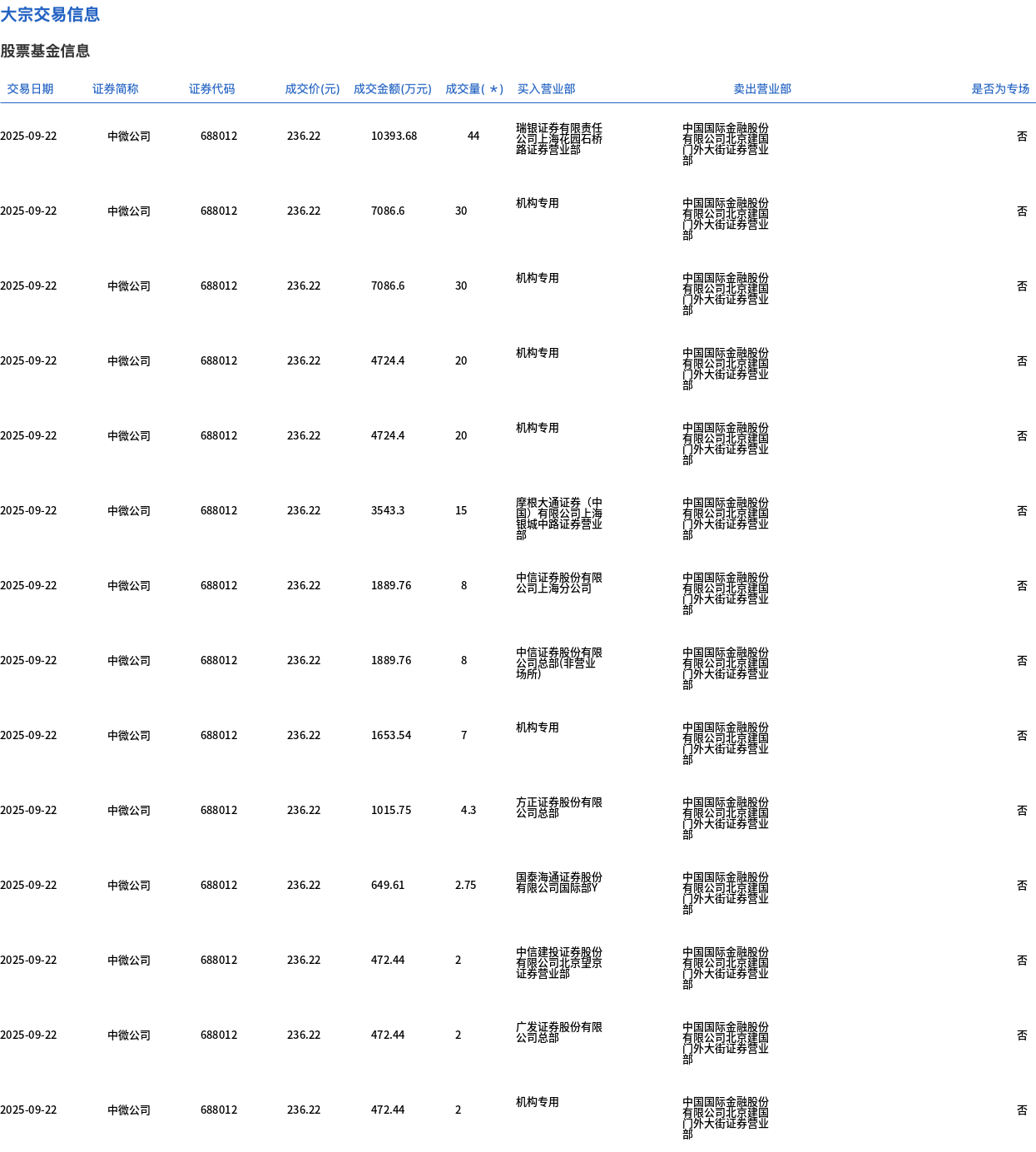 9月22日,中微公司大宗交易成交195.05万股,成交额4.61亿元,占当日总成交额的7.58%,成交价236.22元,较市场收盘价256.6元折价7.94%。