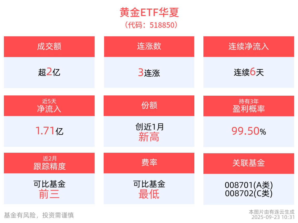 统计显示,黄金ETF华夏(518850)近6天获得连续资金净流入,合计“吸金”1.83亿元,截至9月22日,黄金ETF华夏最新份额达6.37亿份,创近1月新高。