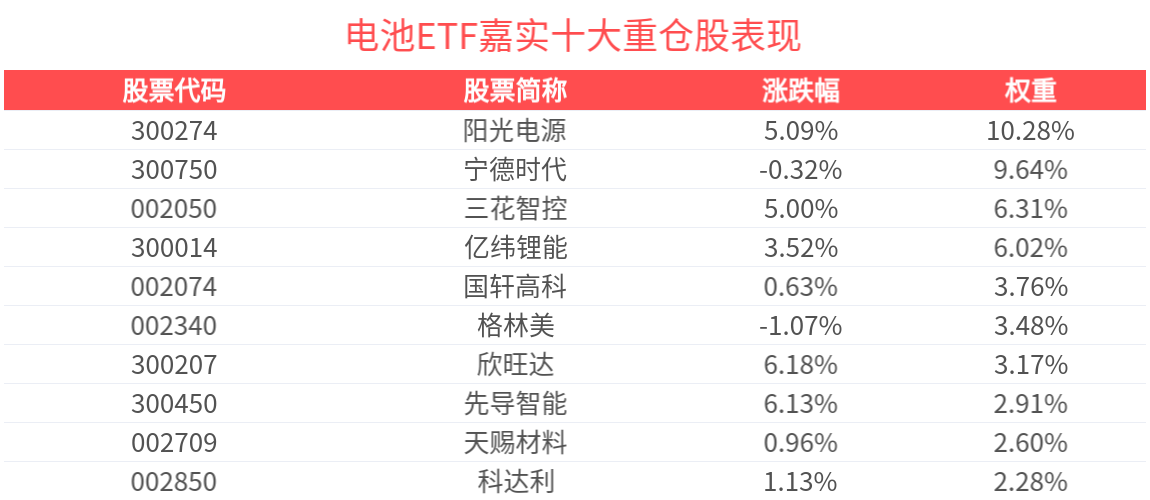 数据显示,截至2025年8月29日,中证电池主题指数前十大权重股分别为阳光电源、宁德时代、三花智控、亿纬锂能、国轩高科、先导智能、格林美、欣旺达、银轮股份、天赐材料,前十大权重股合计占比53.03%。