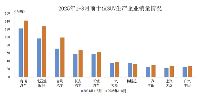 9月23日,据中国汽车工业协会统计分析,2025年1-8月,销量排名前十位的SUV生产企业共销售648.8万辆,占SUV销售总量的66.8%。在上述十家企业中,与上年同期相比,特斯拉销量呈下降,其他企业销量均呈不同程度增长。