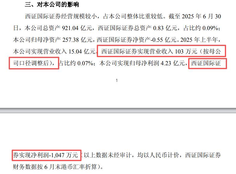 2025年上半年,西证国际证券继续亏损。根据西南证券公告披露,西证国际证券上半年营业收入103万元(人民币,按母公司口径调整后);净亏损1047万元(人民币)。