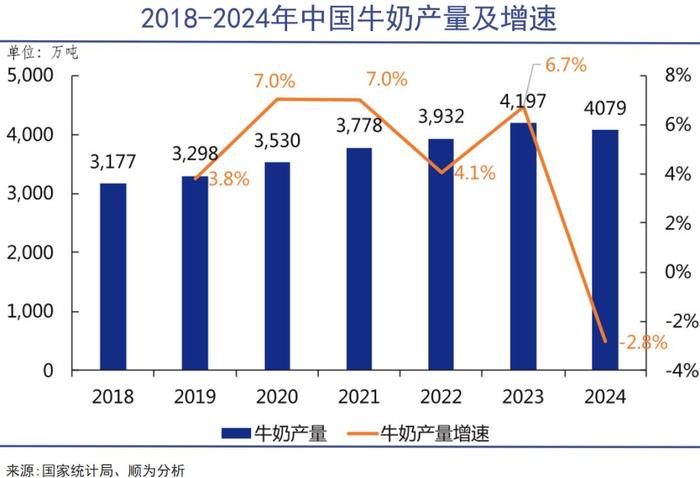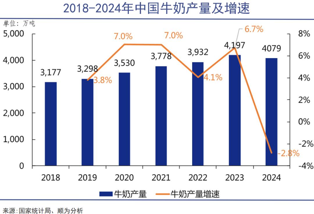 2024年我国年产牛奶4079万吨,相比2000年的产量已经增加了近四倍,但同比2023年略有下降,并且远低于印度(2.4亿吨)和美国(1.04亿吨)的牛奶产出规模。