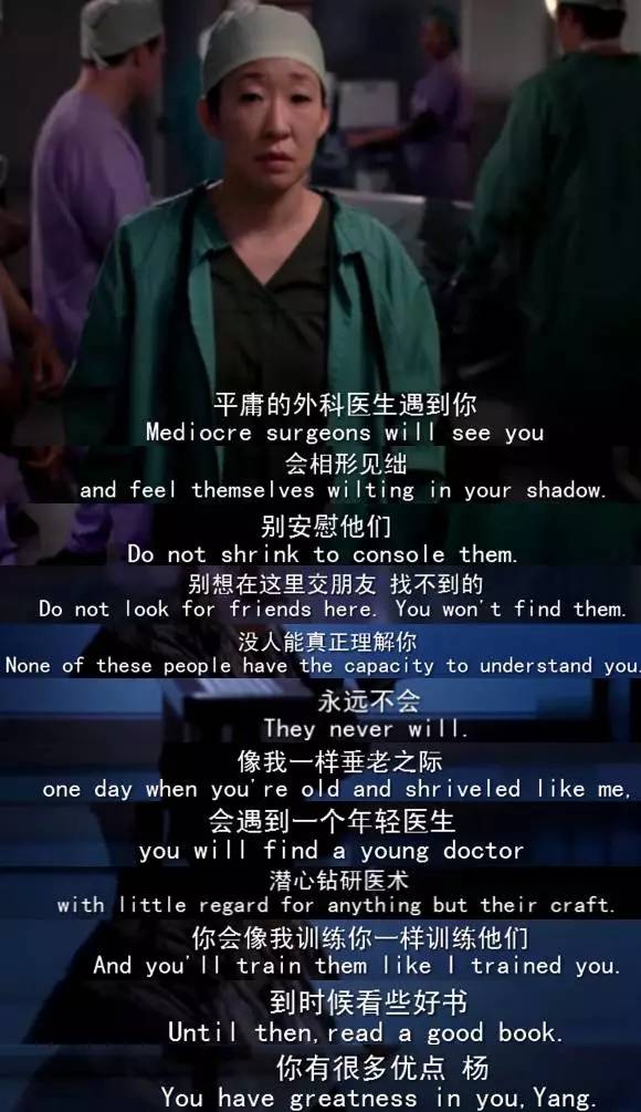 Yang当然也是不折不扣的天才,但在外科手术上却没有Mer那样一上手就熟练的天分,她甚至还有阅读障碍。但她最后却到达了胸外的巅峰,单纯就是因为对手术的热爱和百分百的勤奋。手术是她人生的重心,别的事情她都是一副事不关己的样子。