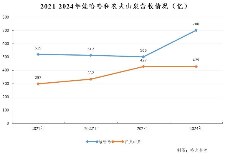 农夫山泉近几年的营收增速明显比娃哈哈快,24年受舆论影响业绩回落