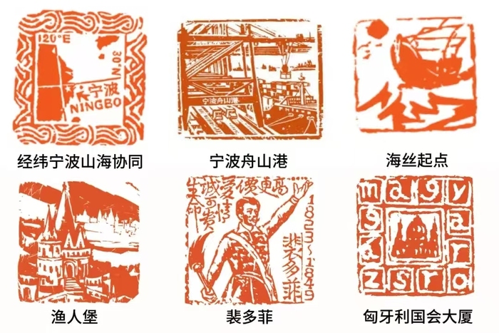 “前言”板块以凝练的文字开篇,阐释图形印“以形表意、以印传情”的艺术特质,点明了本次展览“以印为桥,联通中匈” 的核心主旨。“宁波” 板块将港的壮阔、产的兴盛、城的雅致、文的深厚、旅的悠然尽数呈现 。“中国”板块则将视野从地方延伸至国家,选取长城、熊猫等极具辨识度的文化符号,以艺术语言勾勒中华文脉恢弘轮廓。“匈牙利”板块更是本次展览的点睛之笔,创作者以东方视角解读多瑙河畔的异域风情,布达佩斯渔人堡等标志性景观在印面上焕发新的艺术生命力,实现了中匈文化的巧妙共鸣。