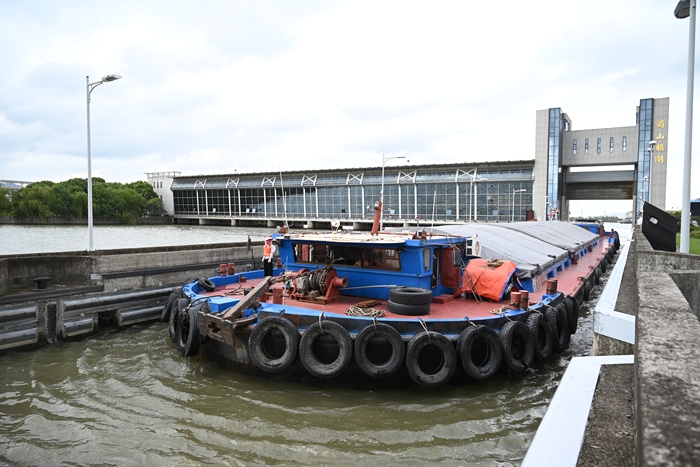 今年6月23日,宁波交通港航部门联合相关部门成功组织了首次试通航。在小雨气象条件下,总长54.6米、总宽10.75米的“绍越航009”货船重载水泥熟料,安全完成过闸流程,为尺度放宽提供了扎实的实践依据。论证结果明确,在落实相应管控措施后,蜀山船闸具备安全通航总长55米以下、总宽10.8米以下船舶的能力。