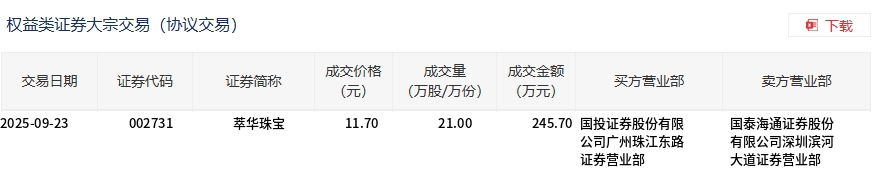 萃华珠宝今日大宗交易折价成交21万股,成交额245.7万元