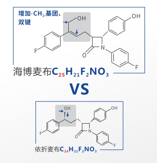 海博麦布与传统胆固醇吸收抑制剂(如依折麦布)均以胆固醇转运蛋白NPC1L1为作用靶点,通过选择性地抑制胆固醇吸收,降低小肠中胆固醇向肝脏的转运,达到降血脂目的。对比依折麦布,海博麦布在化学结构中对羟基进行修饰,优化了结构中能够结合酶的位点,这一结构修饰不仅不会影响海博麦布对NPC1L1 蛋白的抑制效果,反而显著增强了其与体内葡萄糖醛酸的结合能力[3]。