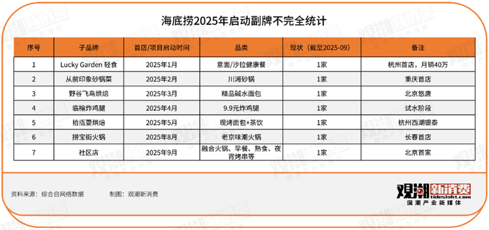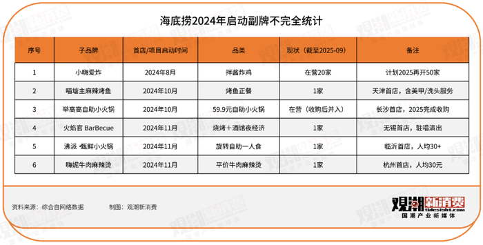 “红石榴计划”下,海底捞接连推出了小嗨爱炸、喵塘主麻辣烤鱼、举高高自助小火锅、火焰宫BarBecue、沸派·甄鲜小火锅、嗨妮牛肉麻辣烫等6个子品牌,其中举高高自助小火锅为收购而来。
