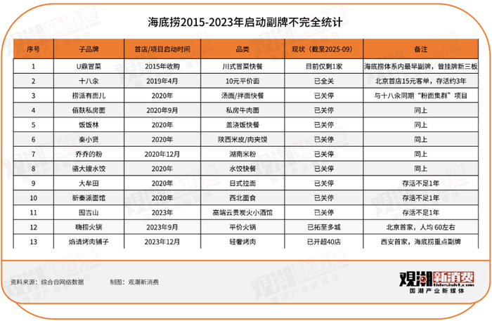 重大亏损促使海底捞重新审视副业节奏。海底捞先是暂时放缓了副业探索,关停大批子品牌,然后把精力聚焦在主品牌上。公开资料显示,海底捞在2023年推出过仅3个子品牌,分别是囿吉山、焰请烤肉铺子和小嗨火锅(原嗨捞火锅)。