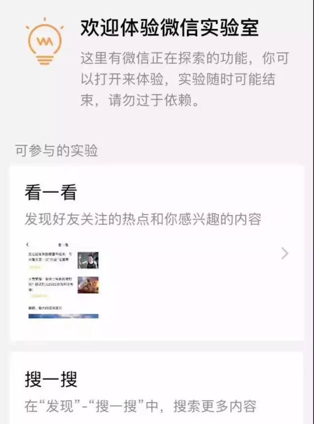 前几天微信iOS版本更新,发布了“微信实验室”,实验室里包含了“搜一搜”和“看一看”两个功能。