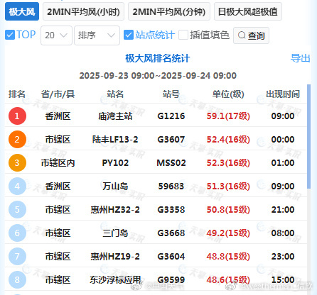 9月24日早晨,超强台风桦加沙从珠江口南侧经过,广东多地阵风到达12级以上,其中,珠海香洲区的庙湾主站位于台风中心北侧,监测到了17级阵风(59.1米/秒)。今天白天随着冷空气南下,“桦加沙”强度可能会减弱为强台风,路径向西分量也会加大。广东珠江口至粤西沿海一带都要继续注意防范强风雨。(中国天气网)