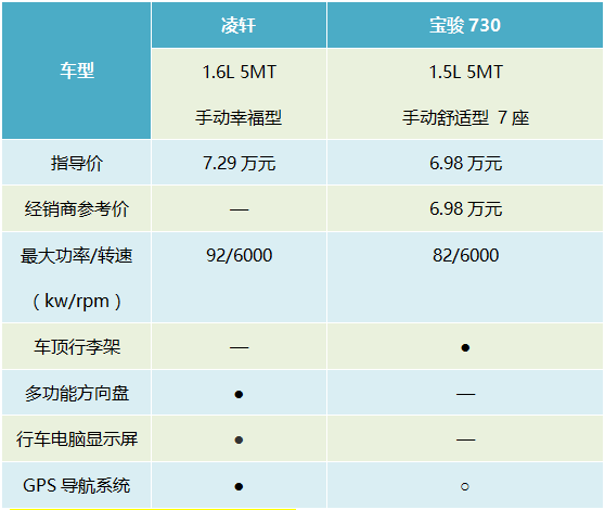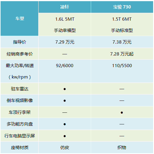再以凌轩售价7.29万元的1.6L 5MT手动幸福型,对比上表中售价6.98万元的宝骏730 1.5L手动舒适型7座,结果如下: