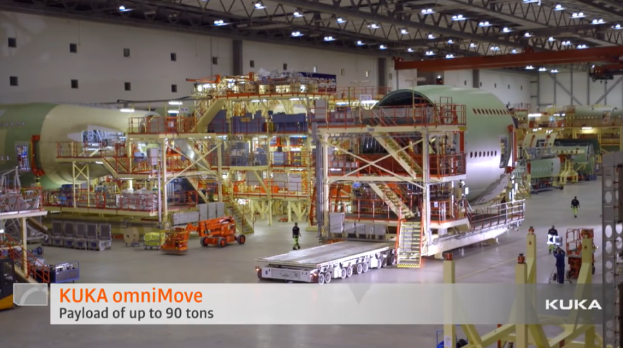 此外,库卡Quantec-2系列工业机器人配合直线导轨、AMR移动机器人等设备,实现机身自动化装配与重型部件智慧物流。针对航空部件体系庞大,部件运输困难,稳定性要求高等严苛条件,库卡旗下瑞仕格物流打造的omniMove全向移动平台承重可达90吨,毫米级运输精度显著提升空间利用与运营效率。目前,库卡在航空领域案例已经应用到空客等公司的核心机型当中。