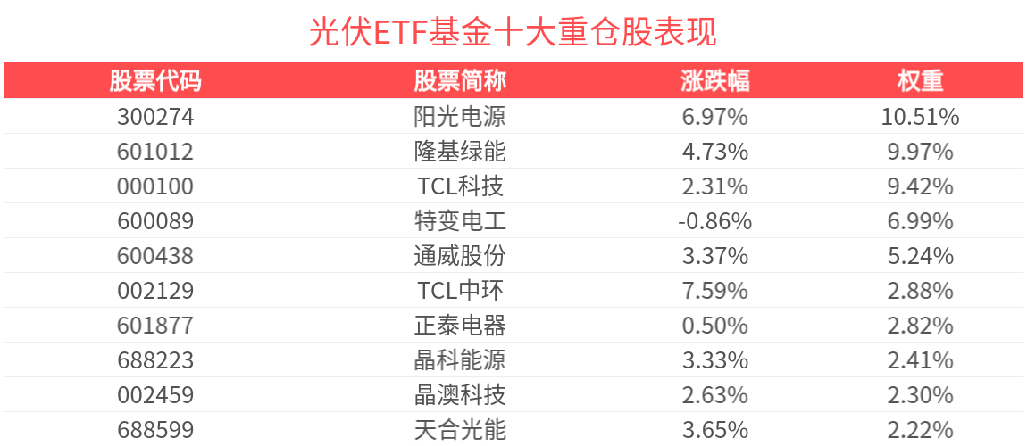 数据显示,截至2025年8月29日,中证光伏产业指数(931151)前十大权重股分别为阳光电源(300274)、隆基绿能(601012)、TCL科技(000100)、特变电工(600089)、通威股份(600438)、正泰电器(601877)、捷佳伟创(300724)、TCL中环(002129)、罗博特科(300757)、晶澳科技(002459),前十大权重股合计占比56.14%。