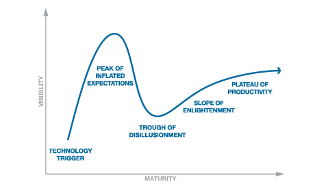 Gartner去年发布了一份新兴技术成熟度曲线图,图中的横轴表示一门新兴技术的发展阶段。一开始是技术萌芽期(Innovation Trigger),吸引了媒体和早期大众的关注。然而媒体过度的宣传会导致不切实际的期待,随后新兴技术进入期望膨胀期(Peak of Inflated Expectations)。