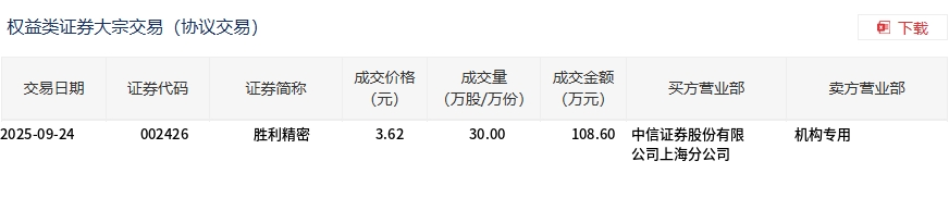 胜利精密今日大宗交易平价成交30万股,成交额108.6万元