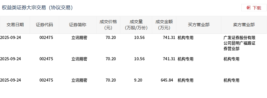 立讯精密今日大宗交易平价成交30.32万股,成交额2128.46万元
