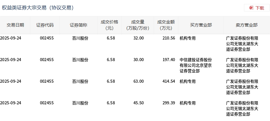 9月24日,百川股份大宗交易成交170.5万股,成交额1121.89万元,占当日总成交额的2.48%,成交价6.58元,较市场收盘价7.45元折价11.68%。