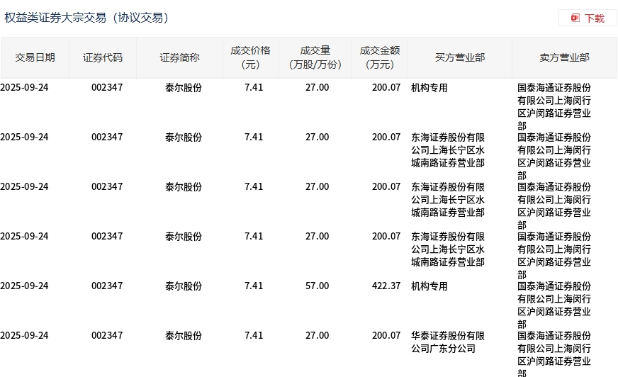 9月24日,泰尔股份大宗交易成交192万股,成交额1422.72万元,占当日总成交额的1.61%,成交价7.41元,较市场收盘价8.91元折价16.84%。