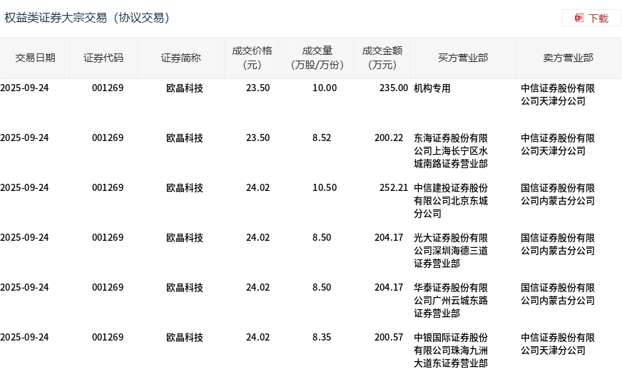9月24日,欧晶科技大宗交易成交54.37万股,成交额1296.34万元,占当日总成交额的11.69%,成交均价23.84元,较市场收盘价27.27元折价12.57%,其中最高成交价24.02元,最低成交价23.5元。