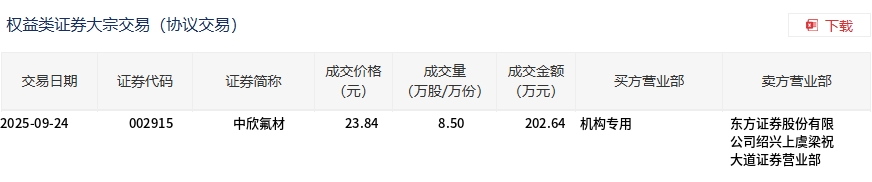9月24日,中欣氟材大宗交易成交8.5万股,成交额202.64万元,占当日总成交额的0.42%,成交价23.84元,较市场收盘价26.81元折价11.08%。