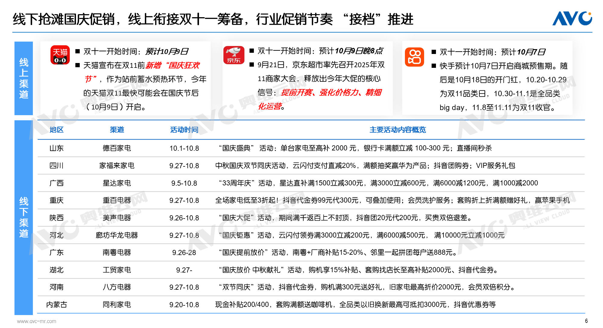 2025 年,家电行业步入政策效应换挡与市场需求调整的关键周期。一方面,2024 年国补催生的高增长基数仍存影响,今年国补转向分批下达与限流管控,拉动效应逐月递减,叠加消费需求疲软,行业整体负增长已成共识;另一方面,国庆、“双十一” 等核心促销节点接踵而至,线下冲刺旺季、线上蓄力大促,渠道分化与品类差异持续凸显。线下抢滩国庆促销,线上衔接双十一筹备,行业促销节奏“接档”推进当前家电行业促销周期紧密衔接,线下渠道聚焦国庆旺季全力冲刺,线上平台则同步为 “双十一” 提前蓄力。在此态势下,各渠道在促销期的表现预计降呈现分化特征:TOP渠道面临经营压力相对突出,渠道为拉动客流,通过自补方式加大优惠力度,部分渠道甚至可能出现价格倒挂现象;大连锁渠道(例如正处于扩张阶段的五星电器),依托规模效应与门店网络布局优势,预计将成为下半年销售表现最优的渠道之一。而线上渠道在此次促销周期中市场表现将有望优于线下。去年同期线下受国补政策强力拉动,形成较高基数,而今年国补资金采取分批下达模式,政策对线下的拉动效应相对平缓,进一步凸显线上渠道的增长潜力。