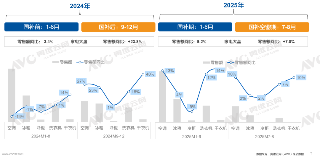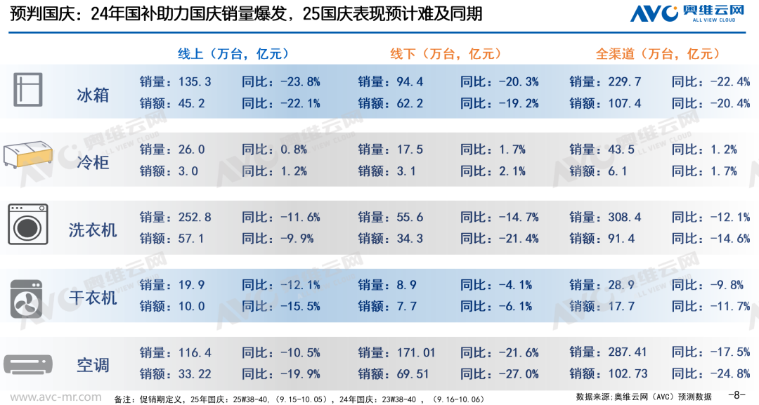 国补边际效应减弱,25年国庆需做好预期管理当前国补政策对家电行业的拉动效应正在逐渐递减。据奥维云网(AVC)推总数据显示,2024 年 9-12 月,家电全渠道零售额大盘同比增长 23.8%,细分品类中,空调、冰箱、洗衣,推总同比增幅分别达 27%、23%、18%,展现出较强的补贴驱动效果;但到2025年7-8月,家电大盘同比增幅已大幅收窄至仅 7%。对比来看,去年9-12月曾受国补显著拉动的家电品类,如今已全线陷入增长失速的局面。