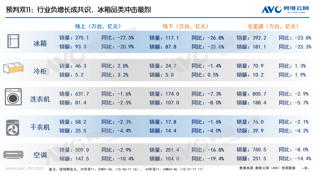 2025 年十一、双十一两大核心促销周期的市场整体表现,预计将很难超越去年同期。分品类来看,冰箱、洗护、空调等传统大家电均将陷入明显的负增长区间。若拉通品类对比其下行压力,产业走势预计呈现洗护<空调<冰箱的梯度分化。其中,冰箱产业所受冲击最为强烈,其负增长率甚至可能突破-20%。