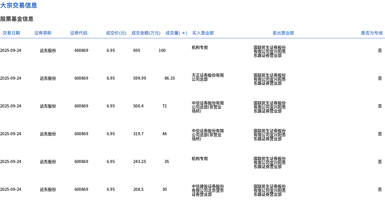 9月24日,远东股份大宗交易成交369.33万股,成交额2566.84万元,占当日总成交额的2.29%,成交价6.95元,较市场收盘价8.14元折价14.62%。