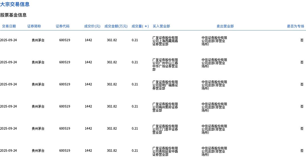 9月24日,贵州茅台大宗交易成交1.26万股,成交额1816.92万元,占当日总成交额的0.41%,成交价1442元,较市场收盘价1442元持平。