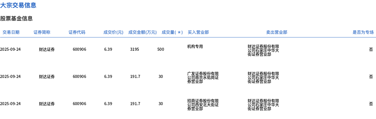 9月24日,财达证券大宗交易成交560万股,成交额3578.4万元,占当日总成交额的17.47%,成交价6.39元,较市场收盘价7.2元折价11.25%。