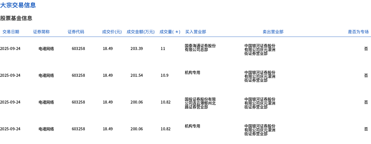 9月24日,电魂网络大宗交易成交43.54万股,成交额805.05万元,占当日总成交额的11.68%,成交价18.49元,较市场收盘价20.95元折价11.74%。