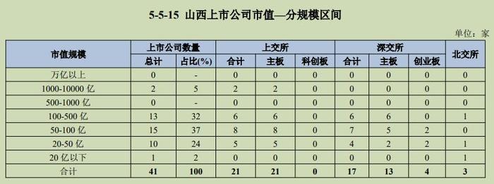 按规模划分,我国千亿以上市值公司160家,数量占比近3%,市值占比超四成,100-1000亿市值公司1703家,20-100亿市值公司3341家。其中,山西无万亿以上规模的上市企业,100-1000亿市值公司2家,20-100亿市值公司共有39家。