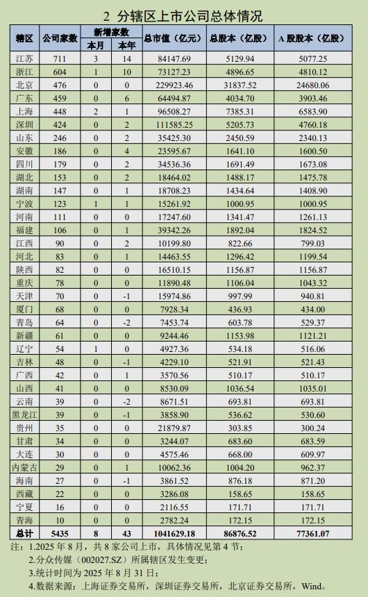 据中国上市公司协会官方微信公众号24日发布的消息,截至2025年8月31日,境内股票市场共有上市公司5435家,沪、深、北证券交易所分别为2286、2875、274家。按省域划分,山西省上司公司家数为41家,总市值8530.09亿元。广东、浙江、江苏上市公司家数分别为883、727、711家,汇集43%上市公司。