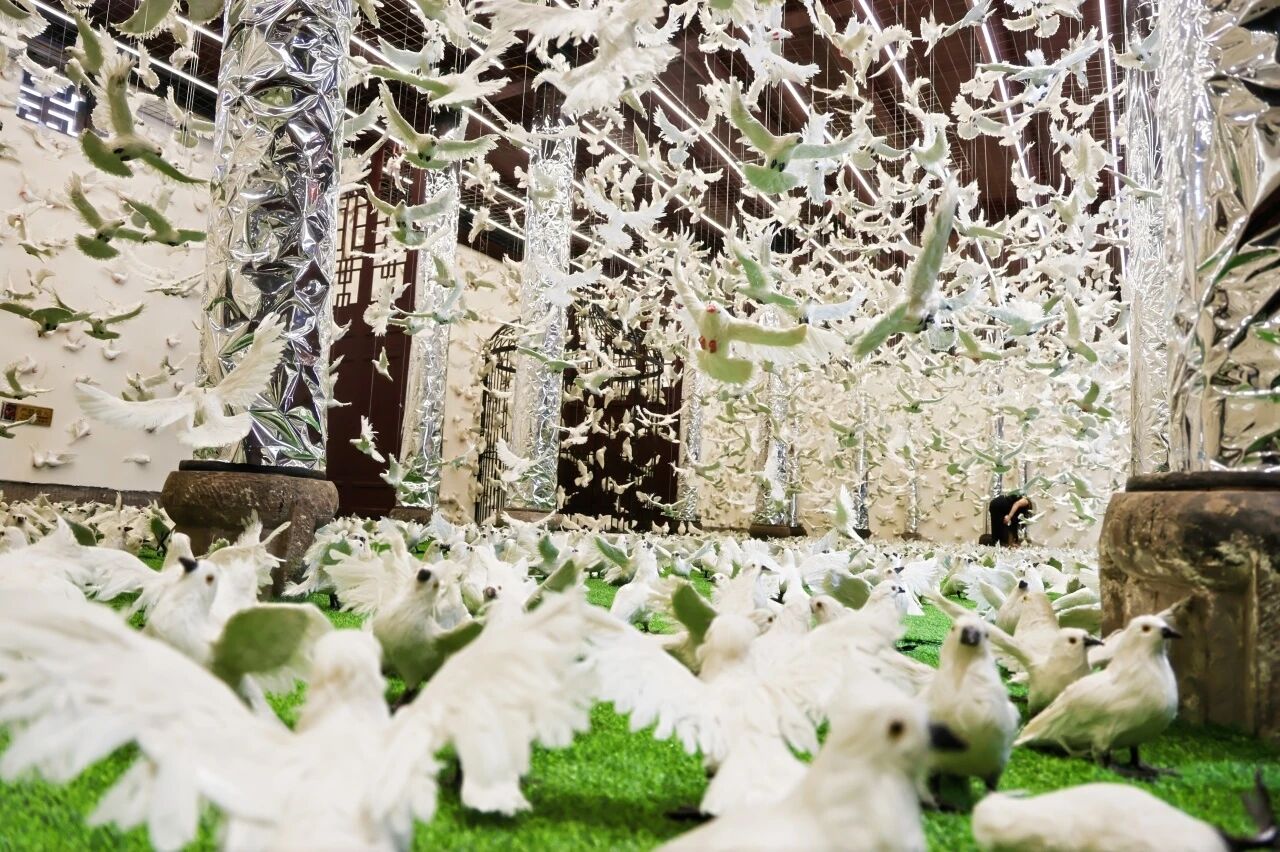 以“童话爸爸”IP 串联古镇经典实景点位与变化丰富的空间格局,将洛带古镇打造为沉浸式童话王国,形成“经典IP+一展(周艺文作品展)+一馆(广东会馆)+一镇(古镇全域)”的立体化组合,构建洛带“童话与现实共振、艺术与生活交融”的差异化定位,展览内容包括《和平广场》《绿马》《沉睡的天使》《钢琴与白鸽》《保鲜期》《被困的文艺复兴》《和平鸽大会》《被开放的鸟笼》《冰雪玫瑰》等70余幅作品。