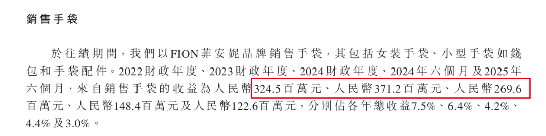 收购之后,潮宏基对“FION菲安妮”品牌形象、产品和门店等进行升级和年轻化改造,但近年来的收入却并不理想。2022年至2024年,其手袋收入从3.24亿元下滑到2.70亿元。