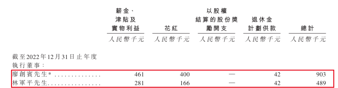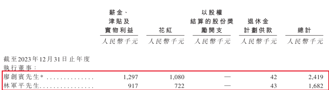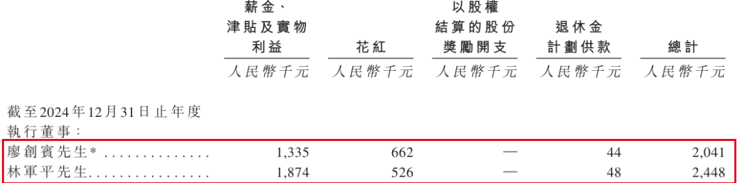 不仅如此,已经接班成为公司董事会主席、执行董事兼总经理的廖创宾,薪酬从2022年的90.3万元上涨到2024年的204.1万元;同期,身为副主席、执行董事兼副总经理的林军平薪酬则从48.9万元上涨到244.8万元。