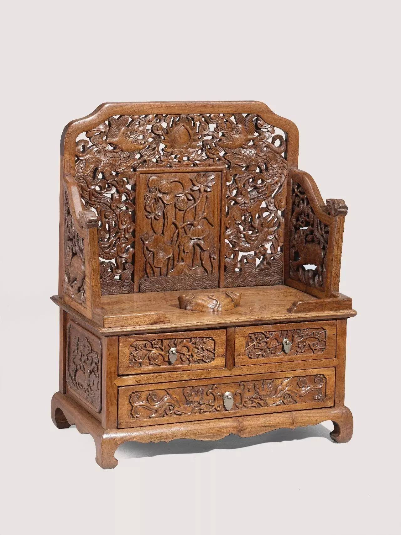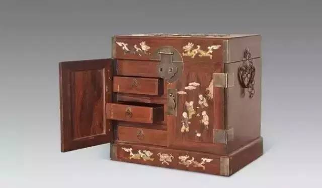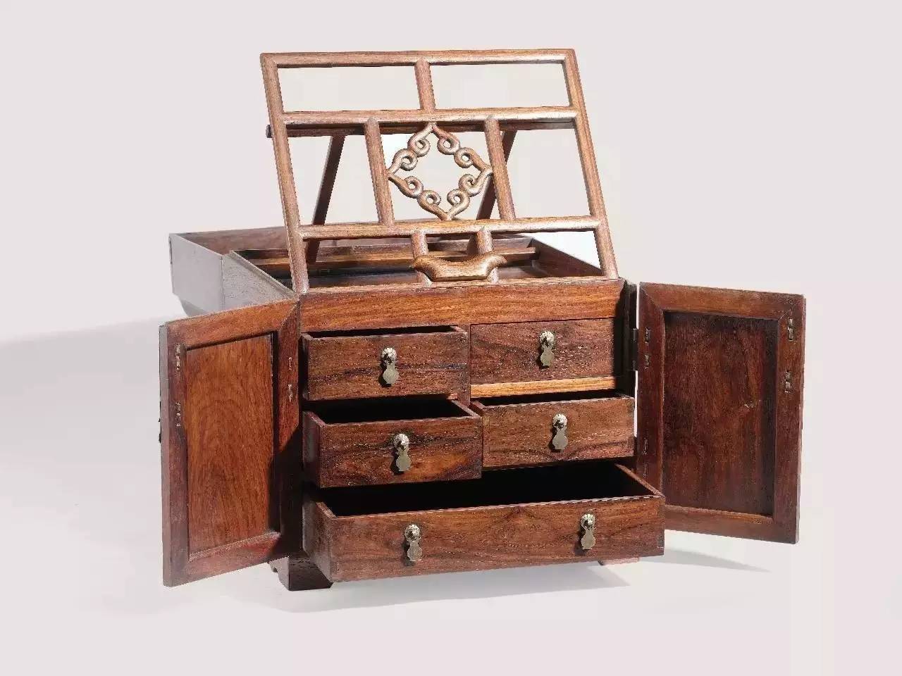 药箱与镜台类似,因为专门的物品收纳特性,药箱和镜台打开后都有大大小小的收纳抽屉,方便存放不同的药品、化妆品等,并且体型不大,容易携带。