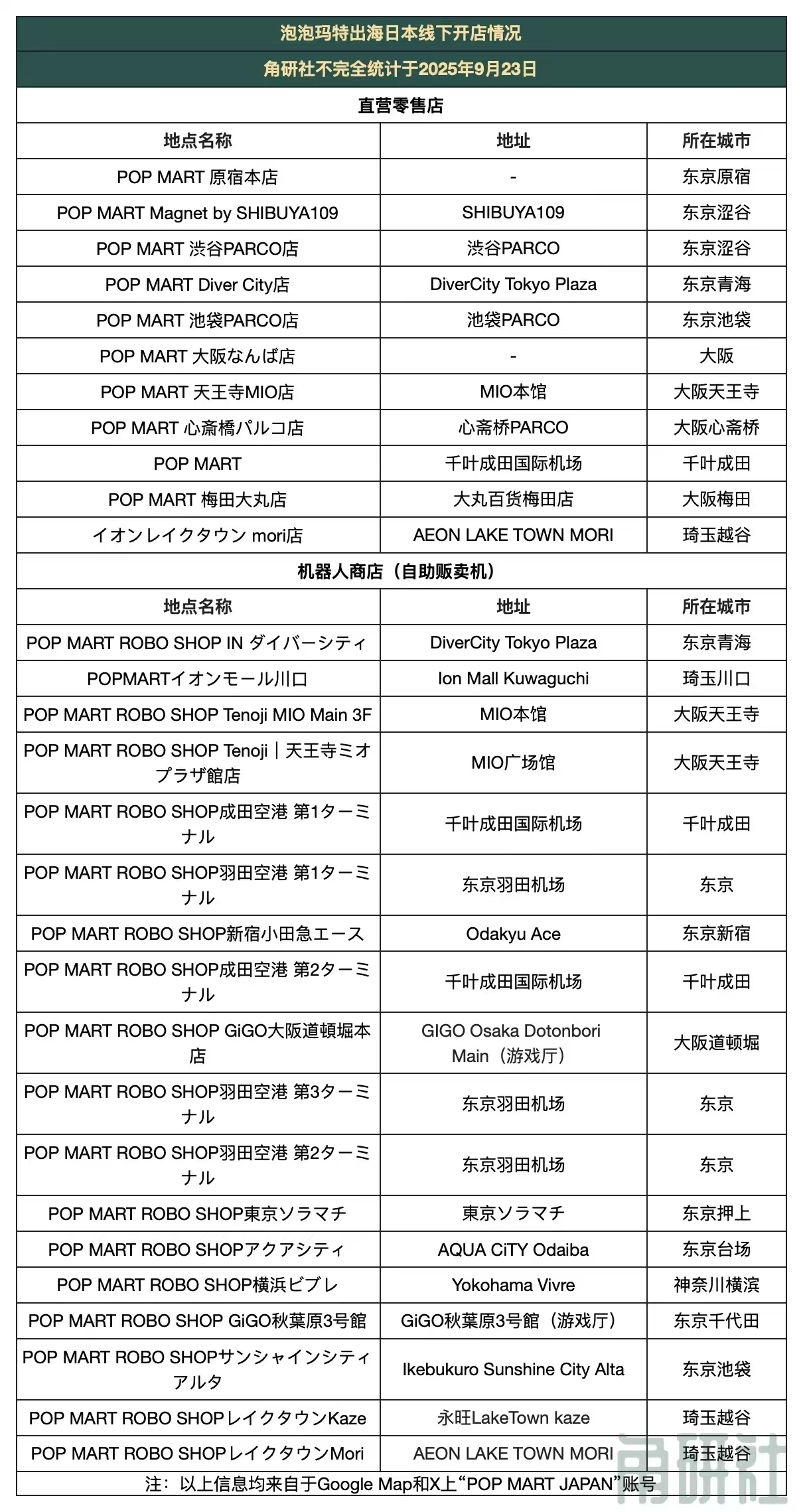 角研社根据谷歌地图检索和泡泡玛特官方信息公布,整理了泡泡玛特在日本开设的线下店铺情况,有29家。11家零售直营店、18家机器人商店(自助贩卖机)。