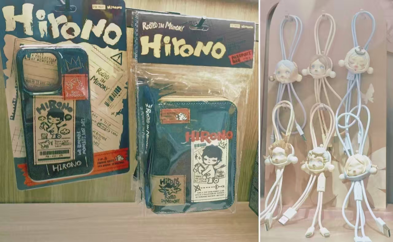 与国内相比,日本门店内显著不同的地方是陈列了许多轻量级周边产品,如小野的数据包、手机壳、SKULLPANDA的三合一数据线、星星人金属挂件等,这更符合当地市场对便携型衍生品的偏好。