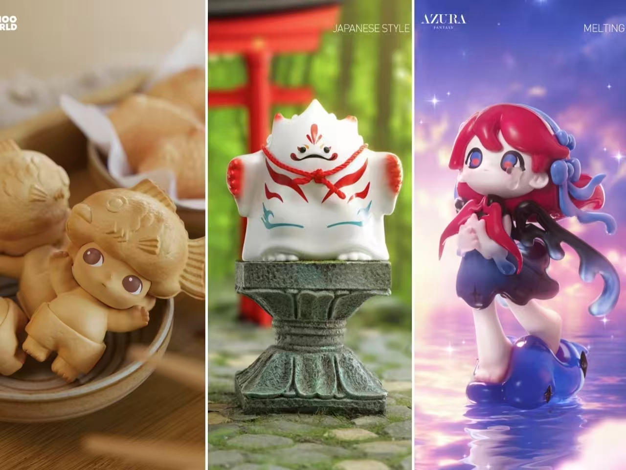 另外,品牌还以自有IP为核心,推出多款日本市场专属限定潮玩,如DIMOO鲷鱼烧手办、YUKI和风系列、AZURA「融化的飞翔」手办,这些产品大多在设计上深度融合鲷鱼烧、和风纹样等日本本土文化元素,是品牌出海过程中本土化定制策略的核心体现。
