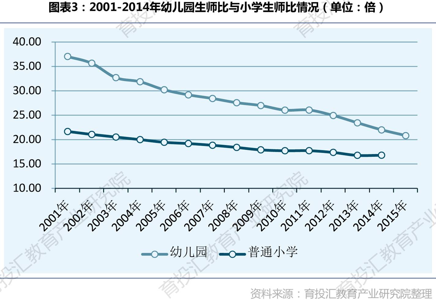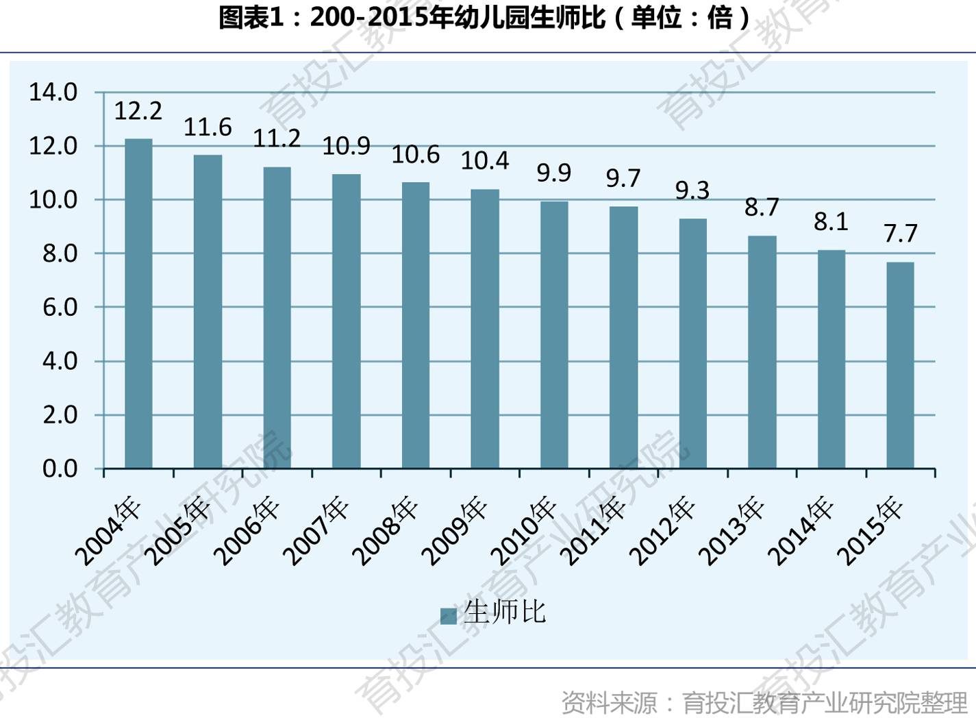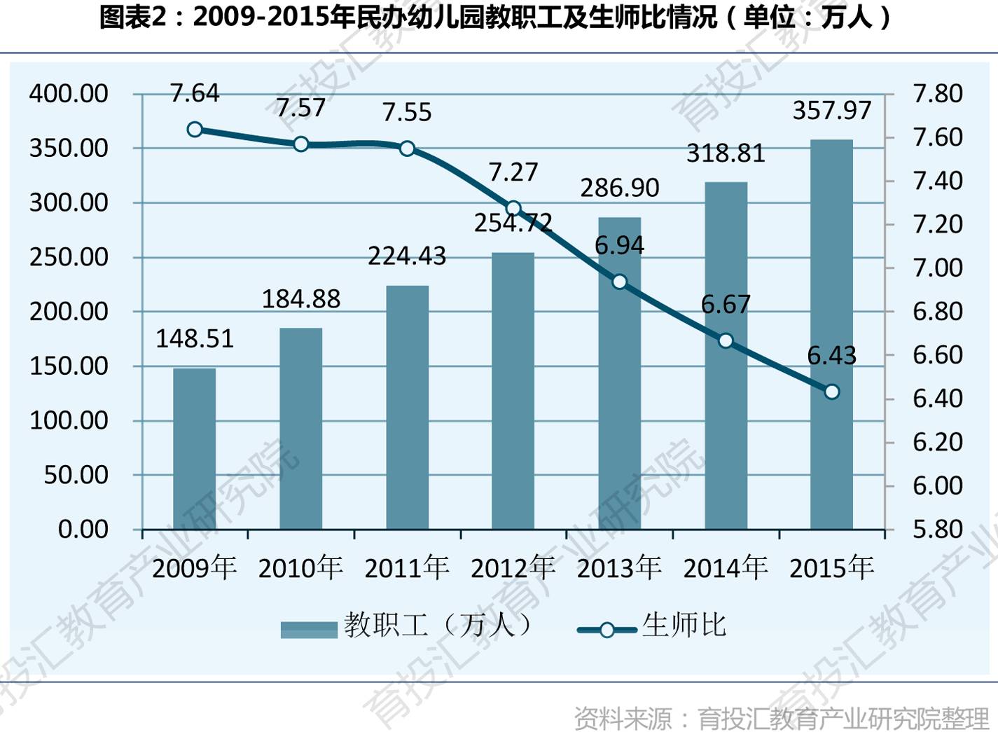 根据育投汇教育产业研究院统计,2015年幼儿园教师和职工数约554.7万人,生师比已从2004年的12.2:1下降至7.7:1。而民办幼儿园专职教师和教职工数为357.97万人,生师比则从2009年的7.64:1下降至6.43:1,基本已达到相关要求。