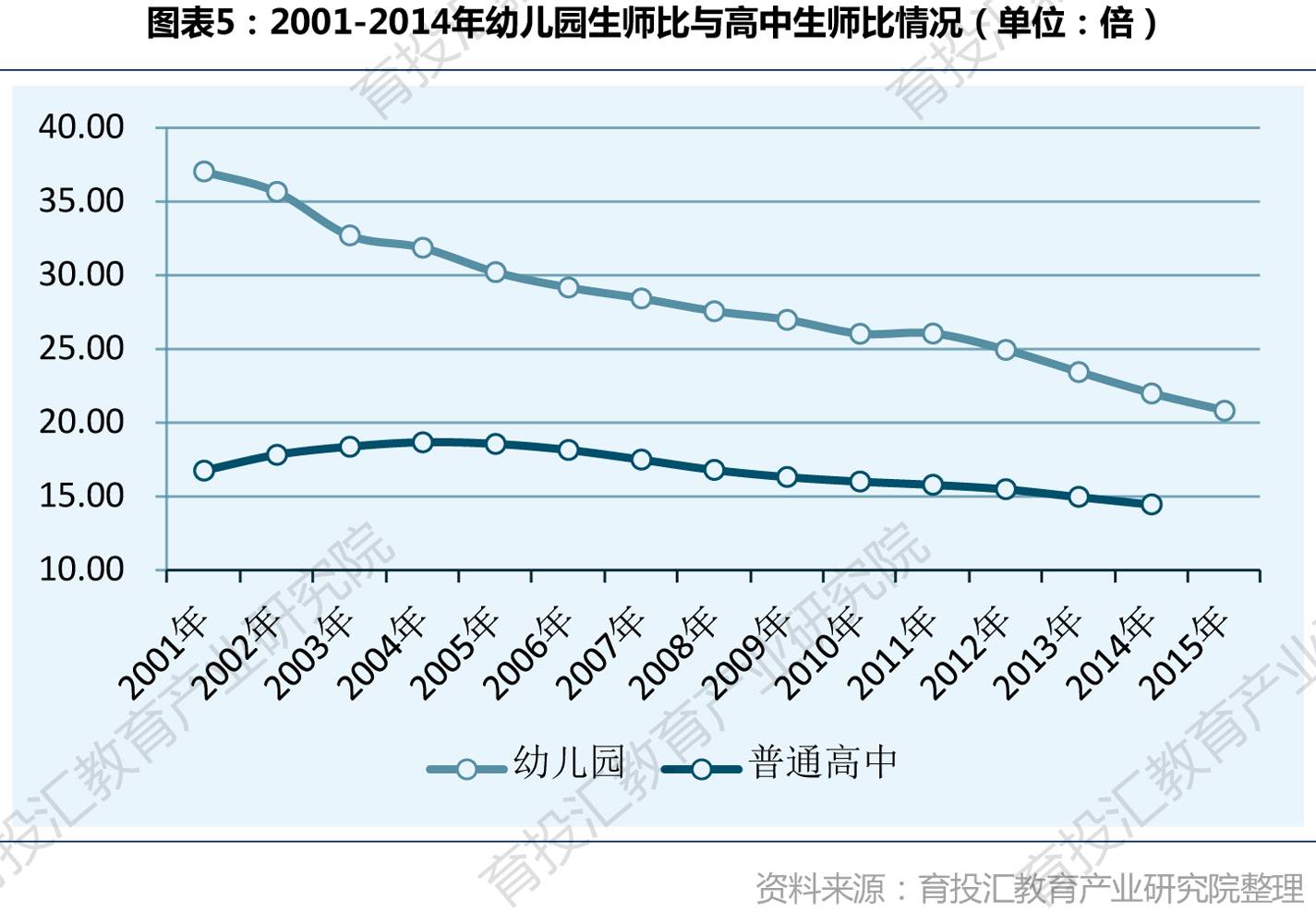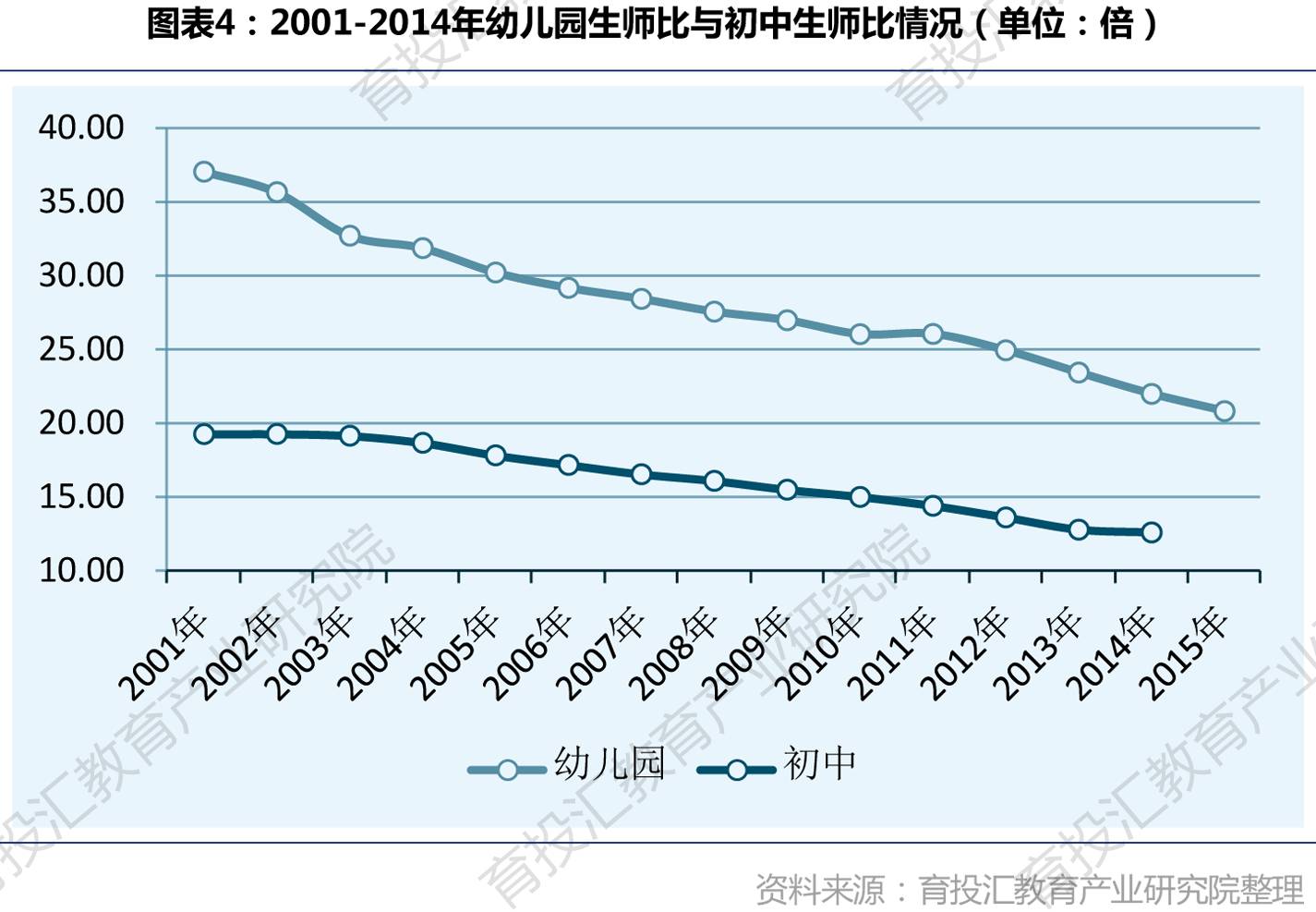 与小学相比,我国初中的生师比更小。2001年,我国初中的生师比为19.24:1,到2014年下降至12.57:1。而幼儿园的情况则是2001年的生师比为37:1,到2015年仍高达20.79:1。