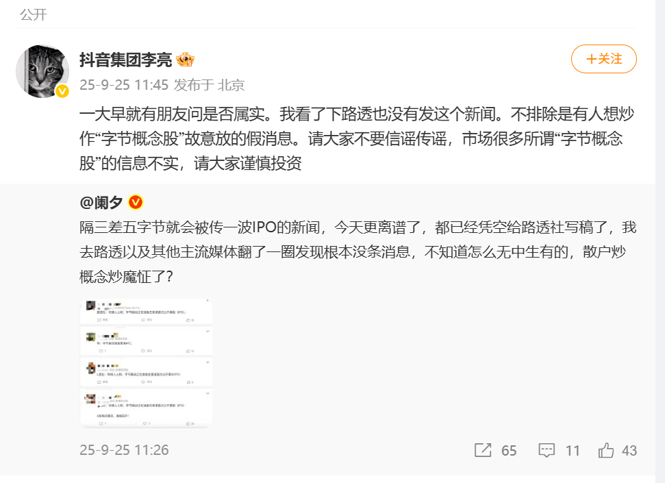 9月25日,有消息称字节跳动准备在中国香港上市。抖音集团副总裁李亮发文回应称,不排除有人想炒作“字节概念股”而故意放的假消息。不要信谣传谣,市场很多所谓“字节概念股”的信息不实,请大家谨慎投资。