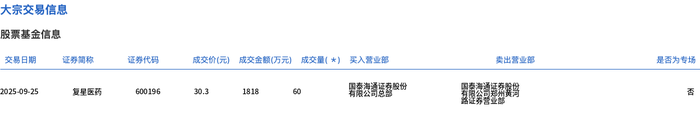 复星医药今日大宗交易平价成交60万股,成交额1818万元