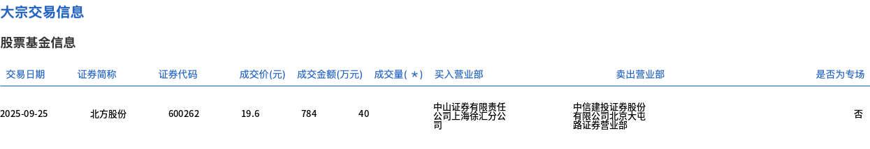 9月25日,北方股份大宗交易成交40万股,成交额784万元,占当日总成交额的12.95%,成交价19.6元,较市场收盘价21.47元折价8.71%。
